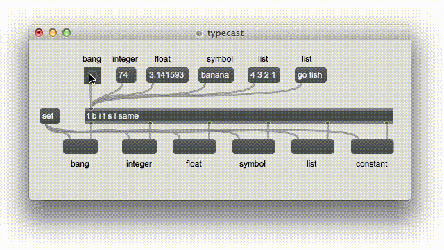 Big takeaway: “t l” will pass anything unchanged! So you can use it to group all kinds of messages together to help declutter your patch. And one more thing: you can use any number or unreserved word as a “constant” argument. Trigger will output that number or symbol regardless of the incoming message.
