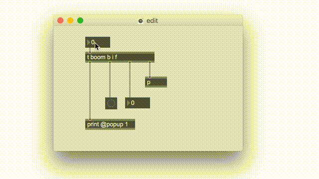 It’s not a bad idea to use trigger anytime an object has more than one patch cord coming from a single outlet. In fact, if you’re patch is complicated, putting in a long trigger object at the top can be a way to define the main components in an orderly way. And if you change your mind later–say you need to add one more process at the end–you can just type in the new argument. After that (noticing the updated outlet assistance), use option-drag (alt-drag on Windows) to select all the patch cords to the right, then drag them the right so that the outlets line up again: